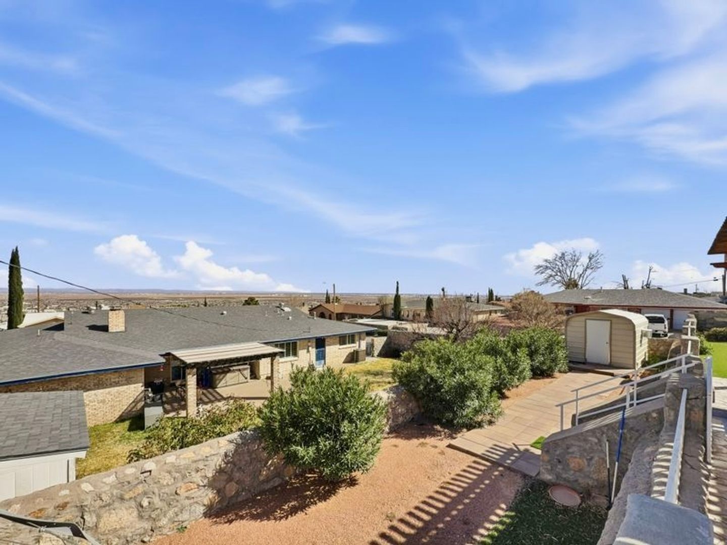 Situated on a desirable corner lot, this well-maintained brick home offers timeless character paired with beautiful city and mountain views. Conveniently located near Patriot Freeway and just minutes from Fort Bliss, the location is ideal for commuters and military families alike. Inside, you'll find a warm and inviting living room featuring exposed ceiling beams and a cozy fireplace - full of charm and architectural detail. The kitchen is equipped with stainless steel appliances, including a cooktop, built-in oven, built-in microwave, dishwasher, and refrigerator. Floor-to-ceiling windows fill the space with natural light and provide peaceful views of the backyard and city beyond -- a bright and comfortable space for everyday living. Enjoy all-tile flooring throughout -- no carpet anywhere -- plus the added convenience of a washer and dryer included. Step outside and relax in your private outdoor sauna spa tub -- perfect for unwinding at the end of the day while enjoying the views.